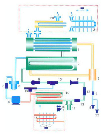 1、空氣熱交換器 2、蒸發(fā)器 3、氣液分離器 4、排水防堵過(guò)濾器 5、手動(dòng)排污閥 6、制冷壓縮機(jī) 7、吸氣過(guò)濾器 8、汽化器 9、分液器 10、氣液混合器 11、熱力膨脹閥 12、視鏡 13、干燥過(guò)濾器 14、儲(chǔ)液器 15、熱氣旁通閥 16、水量調(diào)節(jié)閥 17、水質(zhì)過(guò)濾器 18、冷凝器(風(fēng)冷) 19、冷凝器(水冷) 20、前置預(yù)冷器(水冷) 21、前置預(yù)冷器(風(fēng)冷) 22、自動(dòng)排水器 |